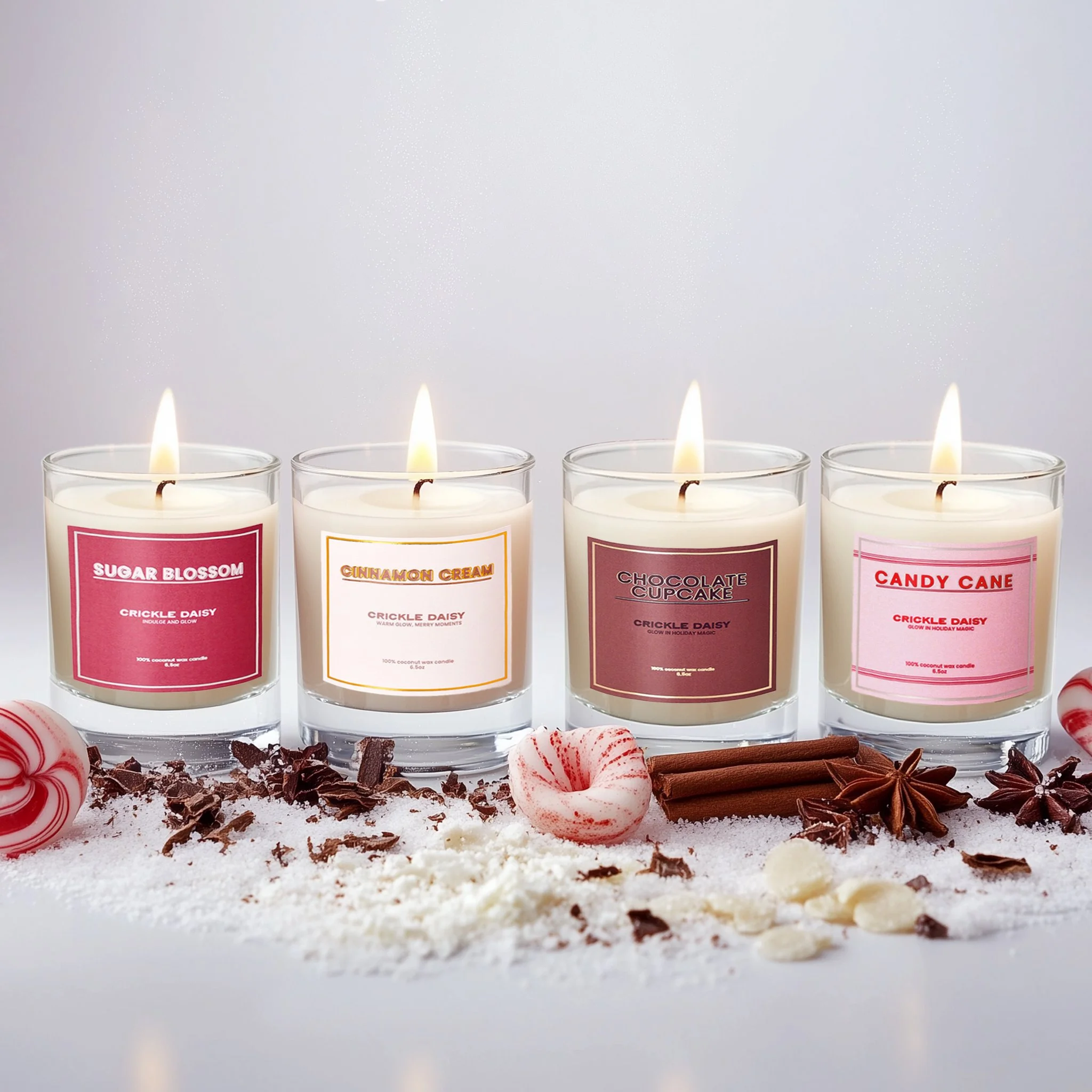 PROMPT // Studio shot of four clear glass candles in a row. Surrounding each candle are thematic elements like candy canes, chocolate shavings, cinnamon dust, and sugar sprinkles, with light snowfall and a clean white background, ensuring all four candles are fully visible